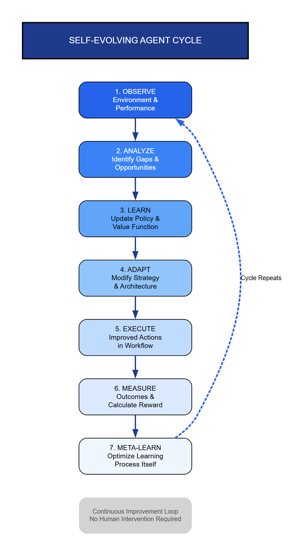 Traditional workflow automation follows rigid, predetermined paths. Self-evolving agents implement adaptive orchestration where execution paths emerge from learned policies rather than fixed rules. The agents observe outcomes, calculate reward signals based on business metrics, and adjust their decision-making strategies through policy gradient methods or Q-learning variants.
